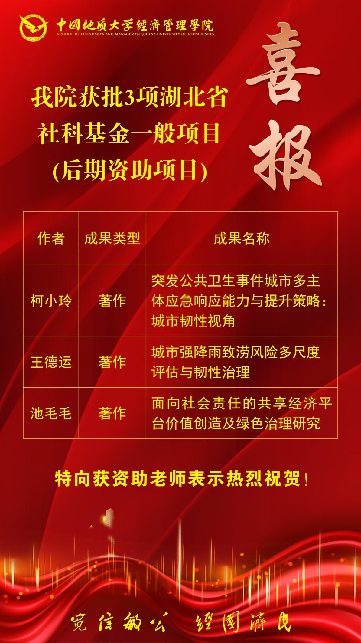 (通讯员 胡松琴)11月14日,2023年度湖北省社科基金一般项目(后期资助项目)拟立项名单公布,2026世界杯预测柯小玲、王德运、池毛毛三位老师申报的课题项目成功立项,公司科研成果再次喜获丰收。