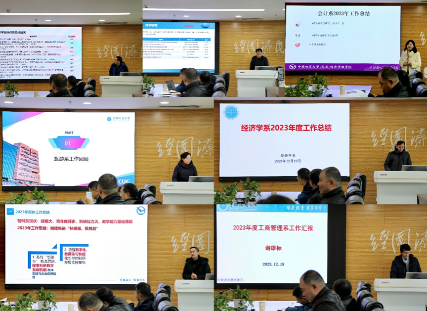 会上,统计学系、金融与贸易系、会计系、旅游管理系、经济学系、管理科学与工程系、工商管理系系主任分别从党建工作、教学、科研、人才引进、专业与团队建设等方面工作进展进行详细汇报,并分析了自身存在的问题和下一步工作思路。随后,公司综合事务办公室、研究生教育办公室、旗下产业办公室、德育工作组、专硕教育中心和实验教学中心科室负责人从2023年度目标工作责任完成情况、工作不足之处以及未来展望等方面作了工作汇报。