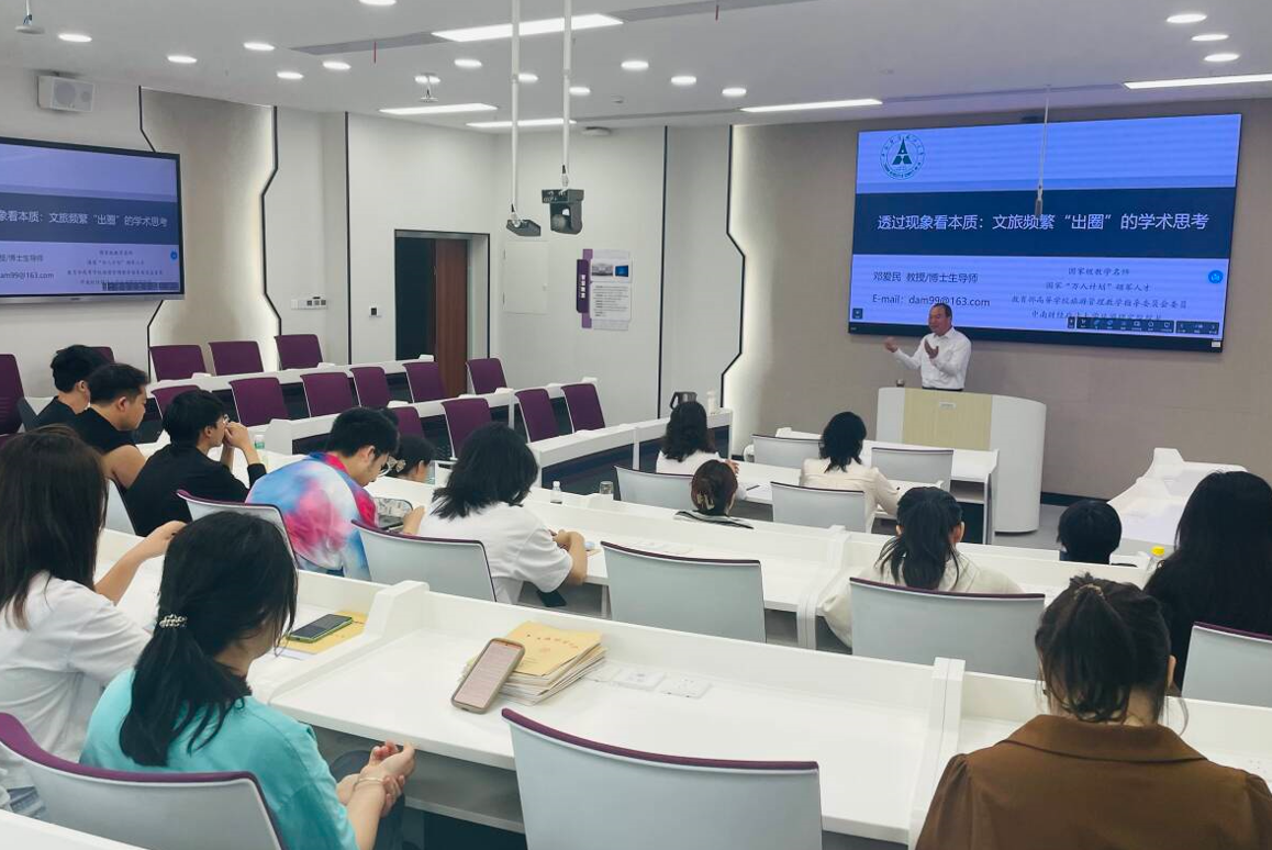 邓教授阐述了“出圈”现象带给我们的启示,提出变“流量”为“留量”、变“网红”为“长红”、变“危机”为“新机”,最终达到“一次出圈,持续出彩”的一系列措施。最后,邓教授与会师生就“出圈化旅游运作与旅游高质量发展”的议题进行了深入的讨论和交流,并与旅游系教师进行相关科研和教学举措的探讨。