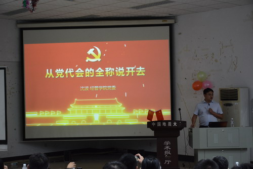 颁奖结束后,由党委副书记沈波同志主持,为全体本科生党员示范“主题党日”,完成规定动作:齐唱国歌、重温入党誓词、学习党章、缴纳党费,以及自选动作《从党代会的全称说开去》党课学习。沈书记从十八大、十八届六中全会的名称说开,分析中国共产党与其他国家政党的区别及优势所在,深入浅出地帮助员工党员牢固树立“四个自信”。