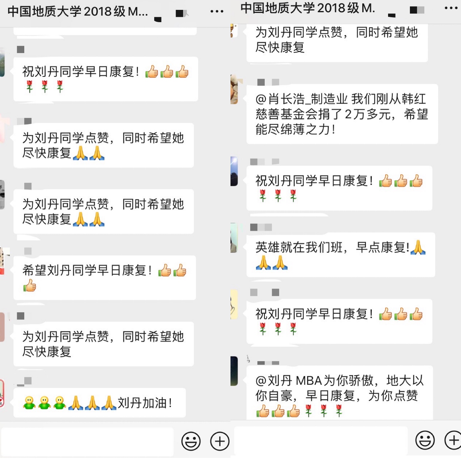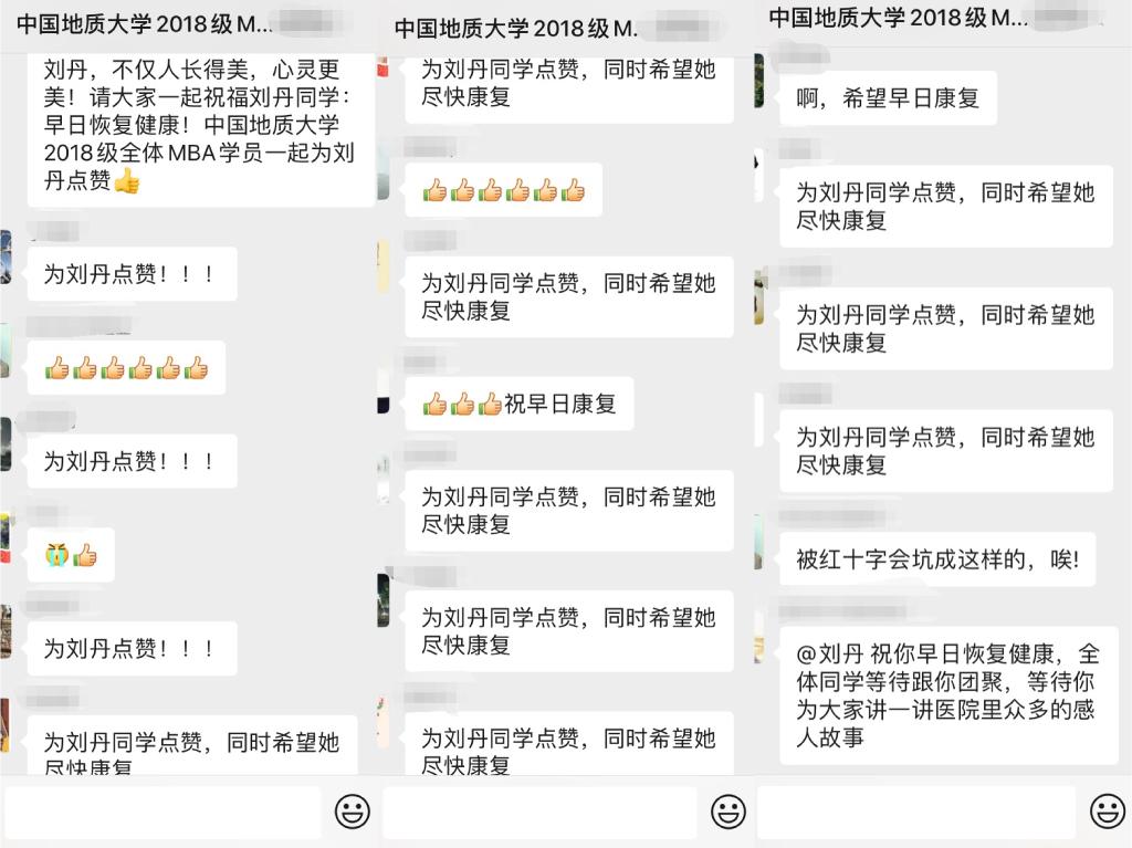 公司领导和老师得知刘丹同学感染的第一时间表达了慰问与关心,并鼓励她放松心情、调整状态争取早日战胜病毒。班级同学们在获悉刘丹同学确诊后都热情地表达了对刘丹同学的祝福,希望她能早日康复。在治疗期间,公司领导和老师与班长一直与刘丹保持联系,时刻关注刘丹同学的治疗情况。由于一月底武汉各医院医护防护物资极度缺乏,经过多方沟通,公司领导及MBA同学一起为武汉市第一医院募捐了一批医疗防护物资。