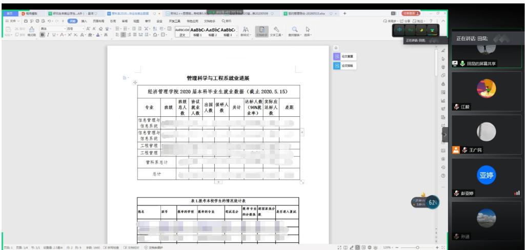 针对应届生就业工作,辅导员田昆老师对管理科学与工程系2020届本研毕业生就业情况进行了详细介绍,并指出当前存在的问题,同时对老师提出的就业政策疑问进行了解答。此外,四个本科生班级的班主任老师也结合各自班上的就业情况和系里各位老师进行了讨论,明确了下一阶段促进不同类型员工就业的针对性方案。