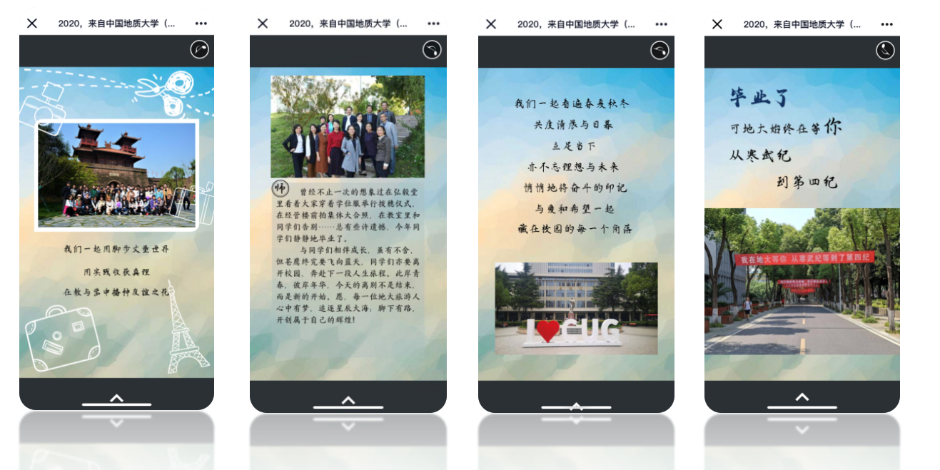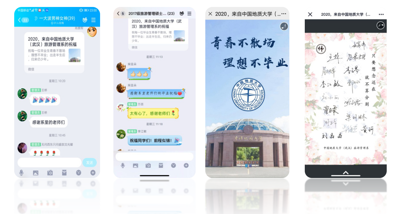 6月24日,第一批返校首日,当陆续落地武汉的学子踏上公司迎接毕业生返校的专车时,旅游管理系085161班同学和2017级硕士生在各自的QQ群里收到一条消息。点开时,同学们收到了由全系老师们精心准备并签名的电子毕业祝福卡——《青春不散场,梦想不毕业》。淡淡的伤感和深深的留恋随着The Simpler Time的BGM流淌,一帧帧照片,是满满的回忆,记录着同学们成长的足迹,一字字祝福,是殷殷的深情,表达着老师们放飞的不舍。