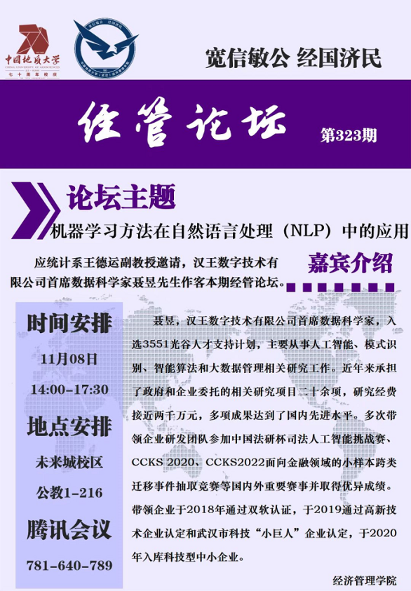 为了解行业前沿,进一步提高员工的研究创新能力、开拓研究视野,统计系王德运副教授邀请武汉汉王数据技术有限公司首席数据科学家聂昱先生做客第323期经管论坛。