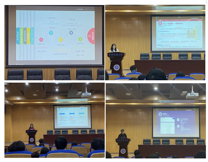 首先,2019级刘瑾沂同学、2020级任逸霏同学和蔡丽云同学以及2021级苏海滨同学做了参赛经验分享。刘瑾沂同学在线上讲述了从大一到大四参赛的心理历程变化,并梳理参赛过程。她强调不要自我精神内耗,鼓励同学们在学有余力的同时通过参赛来检验和提升专业能力;蔡丽云同学结合自身经验,着重介绍了各种数学竞赛的主办单位、竞赛时间、报名费用、获奖设置等,建议参赛前要自身定位:“你擅长什么?对什么感兴趣?数学能力?编程能力?”,同时收集一些优秀论文和之前的比赛题目,了解基本的赛题类型和方法。参加国赛,前期积累也非常重要,可以以小赛促学,不断调整训练的侧重点。她分享了相关参考书籍和网上课程,同时提醒同学们要寻找靠谱的团队,大胆迈出第一步;苏海滨同学分享了竞赛信息来源,对竞赛团队中责任分工和保持良好心态做了分享,建议多和指导老师沟通,了解自己在比赛时还存在的不足与欠缺,及时改进。同时提醒同学们要注重平时课程作业的质量,它不仅可以了解各种报告和论文的格式,还可以有效锻炼自己的文本表达能力;任逸霏同学对参赛收获做了分享,认为参赛不仅可以提高专业知识技能,还可以在写作能力、信息检索能力、扩宽视野、社交能力等方面得到锻炼,提升自己的综合素质。并对英文类型的竞赛以及前期竞赛准备做了重点分享。四位优秀同学分享参赛经验后,王林珠老师对公司和公司认可的重点竞赛进行了补充介绍。