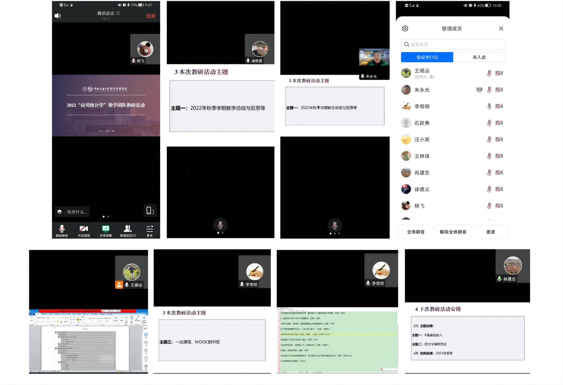 2022年12月8日,公司统计学教学团队于线上开展了第一次教研活动。本科生院副经理杨飞教授、公司副经理肖建忠教授全程参与了讨论并分别给出了建议或指导意见。统计学教学团队成员徐德义、李奇明、王德运、王林珠、汪小英、诸艳霞、石跃勇、朱永光等参加了本次活动。本次教研活动以2022年秋季学期教学总结与反思、配套教材的编写、一流课程申报三大主题展开,教学团队成员进行了充分的讨论,取得了良好效果。