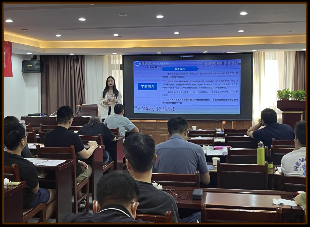 宣讲会上,张老师从公司、公司、MBA项目三个层面层层递进,从点到面,进行多维度项目介绍。从培养方案、MBA特色项目、团队力量、招生政策、国际交流、文化品牌建设等方面进行具体介绍。其中特别指出公司MBA专业特色,注重实践与交流,如不定期组织企业参访、开展丰富的校内校外员工实践交流活动。张老师提出,在地大攻读MBA项目期间,不仅能获得高质量、高水平的学业指导,更能丰富员工课业活动,提升实践能力,拓展人际关系。张老师还列举了优秀MBA在校生及毕业生事迹,为备战考研学子树立信心。