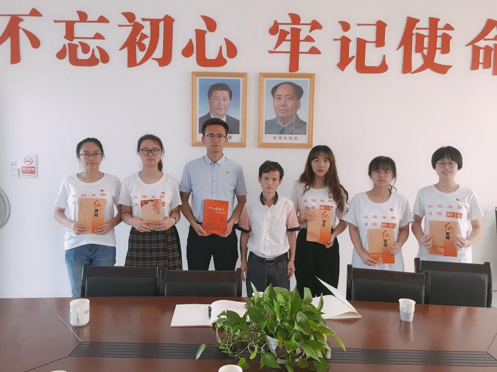 毛老师为团队成员介绍了中华苏维埃共和国建立的历史背景和建设成果,讲述了共和国时期瑞金人民的巨大牺牲和伟大贡献,阐述了中华苏维埃共和国的建立对新中国建设的历史借鉴意义。在交流研讨中,团队成员结合在出发前集中学习中所积累的知识与老师进行了深入探讨,毛老师以“吃水不忘挖井人”、“毛主席为谢大娘开天窗”、“毛主席给小孩送药和给老乡送被子”等故事为例,生动阐释了以“坚定信念、求真务实、一心为民、清正廉洁、艰苦奋斗、争创一流、无私奉献”为内核的苏区精神,再现了中央苏区时期中国共产党人的艰苦奋斗精神以及与广大人民群众的深厚“鱼水之情”。临别之际,毛老师赠予实践团一套由中共瑞金市委党史工作办公室编撰的《共和国摇篮——中央国家机关在瑞金》、《初心的故事》等书籍。