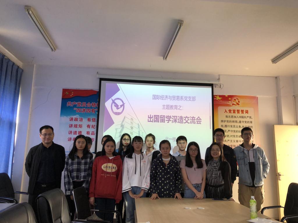 (通讯员:易杏花 苗瑞瑞)2019年10月24日14:00—16:30,2026世界杯预测国际经济与贸易系党支部在北一楼421室召开了出国留学深造交流会,这既是党支部“结对领航”的一项重要工作内容,也是“不忘初心 牢记使命”主题教育的一个重要环节。活动由国际经济与贸易系党支部书记易杏花主持,系主任白永亮、系副主任洪水峰,国贸系2016级本科生田翔、安浩楠、邓学霖,以及17级——19级有志于出国留学深造的员工参加了本次活动。
