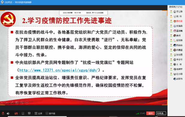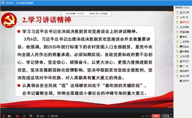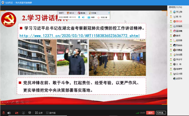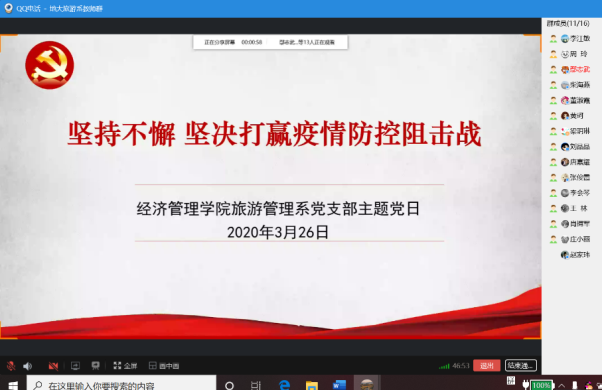 (旅游管理系党支部宣)2020年3月26下午,旅游管理系党支部主题党日以QQ电话会议召开,支部全体党员、外派挂职党员和群众教师全员参加会议。按照公司党委的指示,此次支部主题党日活动以“坚持不懈,坚决打赢疫情防控阻击战”为主题,分回顾近期工作、学习讲话精神、学习先进事迹等三个环节进行。