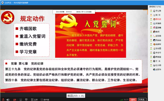 学习活动的最后,李江敏书记带领大家重温了党章第七章的内容,即“党的纪律”,要求全体党员教师必须严格执行和维护党的纪律,自觉接受纪律约束,在关键时期要提高政治站位、增强责任意识,要将纪律挺在前面,发挥出党员在复工复学、师生返校工作中的先锋模范作用,并号召群众教师务要严格遵守各方面的复工复产和返汉返校纪律要求,保障校园环境的安全,为有序恢复公司正常工作秩序作出应有的努力。