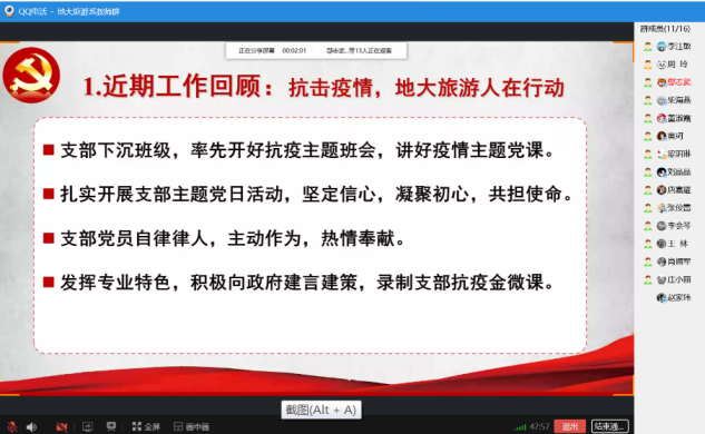 学习一开始,支部书记李江敏以“抗击疫情,地大旅游人在行动”为主题,对前一阶段支部和全系师生抗疫情况作了简要回顾和总结。在前一阶段,旅游管理系全体师生坚决响应党中央和国家教育部的号召,以坚定的信心和必胜的决心投入到抗击疫情的教学、学习和生活之中,大家在工作和学习中共担使命,主动作为,奋发创新;在生活中守望相助,自律律人,热情奉献。线上开学以来,旅游管理系全体教师坚守“立德树人”初心,不仅实力保证线上课堂教学高质量推进,还在员工思想教育和心理舒解、学业和就业指导中戮力同心,孜孜不倦,在战“疫”时期的旅游人才培养和团队建设的征程上共同奋发前行。另外,旅游管理系教师还充分发挥专业特色,为政府提供灾后旅游产业复工复产的政策建言,设计制作支部抗疫金微课等,展现出地大旅游人的社会责任和担当。
