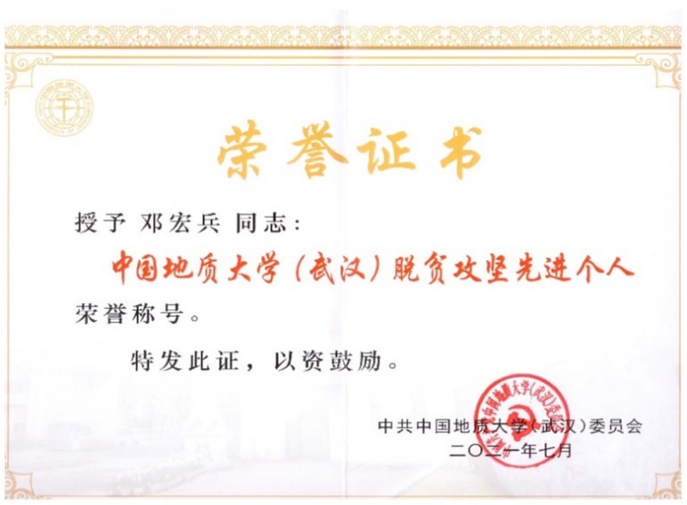 邓宏兵主持与脱贫攻坚、乡村振兴相关国家社科基金项目等20余项,出版相关著作10余部,发表相关论文30余篇。作为省政协委员,该同志多次参与脱贫攻坚、乡村振兴等问题调研,近年来向湖北省政协提交13件提案,其中《创新乡村营商环境促进“新乡镇企业”大发展》《大力培养乡土人才突出村民主体地位》等提案直面当前扶贫脱贫与乡村振兴中的重大问题,相关建议4次被湖北省领导签批。作为湖北省宣讲团成员,该同志围绕乡村振兴、长江经济带高质量发展等问题,先后给17个省市干部培训班、党委中心学习小组作辅导报告70余场,提出乡村发展的建议和对策。该同志积极参与公司科技扶贫工作,主持编制《竹山县秦古镇乡村振兴发展示范区总体规划(2021-2030)》,描绘秦古镇未来10年的发展蓝图,义务帮助乡村遴选项目、编制招商引资指南和发展规划。光明日报、学习强国等媒体报道该同志参与扶贫与乡村振兴工作情况,获奖证书见图3。