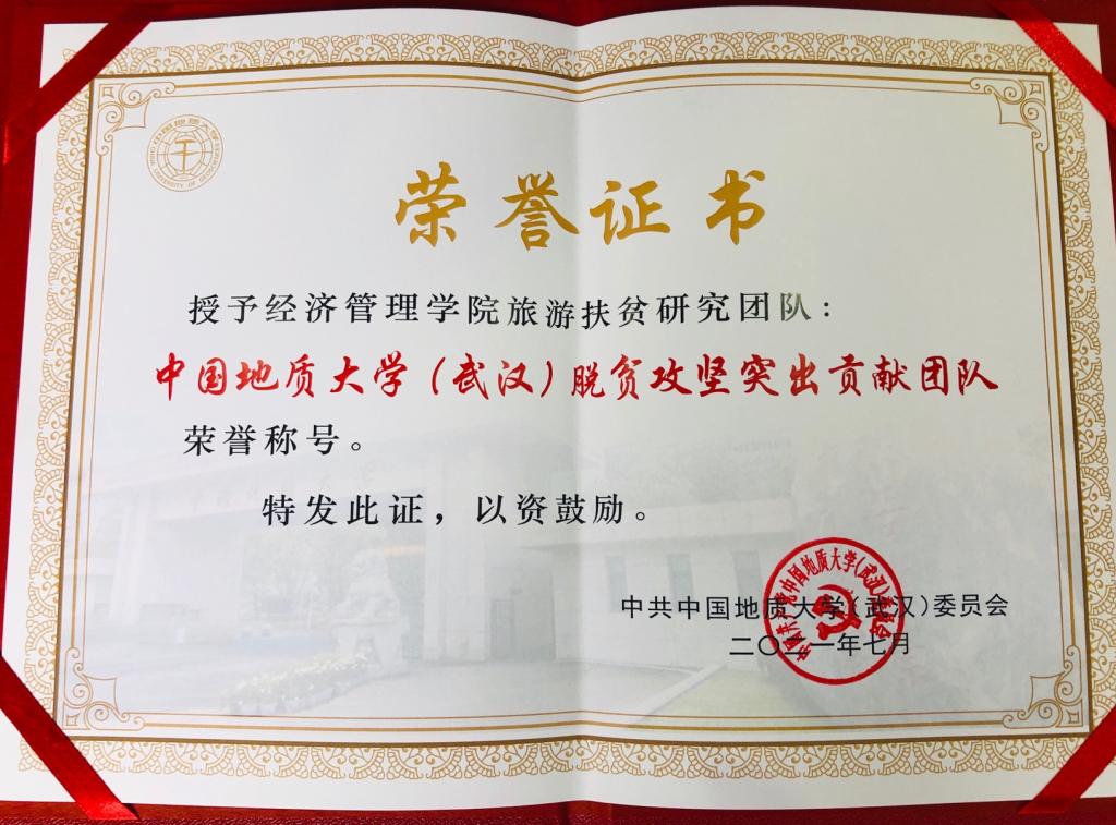 图1帅教授带领的“精准脱贫项目评估研究团队”获得的“脱贫攻坚突出贡献团队”荣誉证书