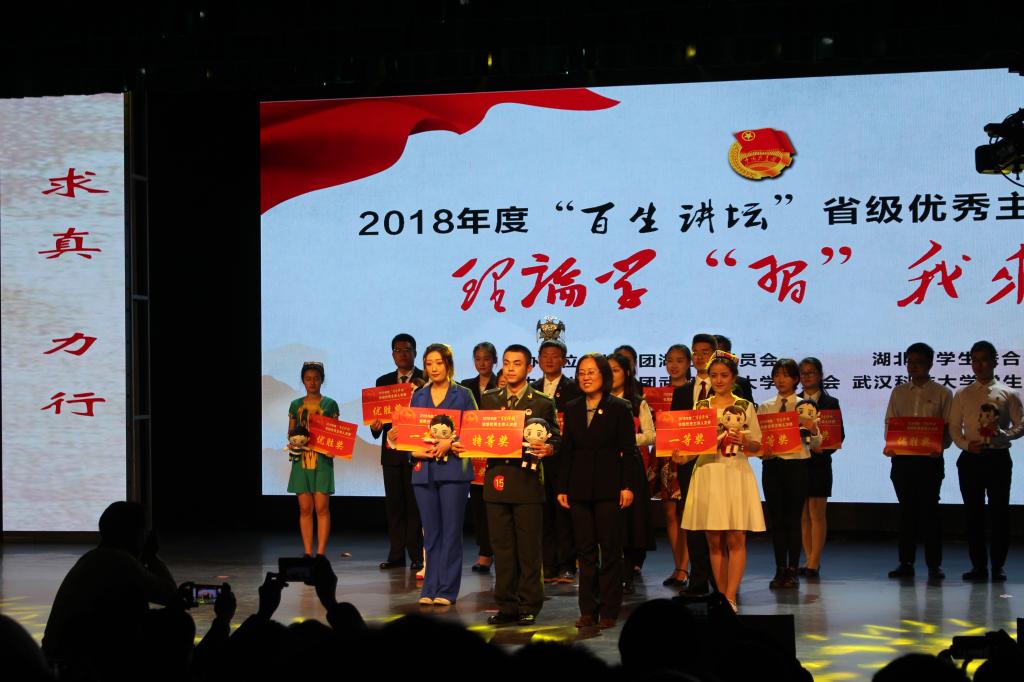 据悉,自2015年起,团湖北省委通过“校院班”三级联动、省级赛事示范推广,已将“百生讲坛”打造成为湖北高校最具口碑、覆盖面最广的思想引领活动品牌;“百生讲坛”省级优秀主讲人已成为湖北高校学子中一张亮丽的名片。参与2018年决赛的选手有来自湖北省16所高校主讲人共18名(组)。选手们通过讲演和视、音、画等多媒体形式,展现当代青年风采、分享学“习”体会,来自全省各高校的千余名师生代表现场观摩比赛,线上10万余人观看了活动直播。、