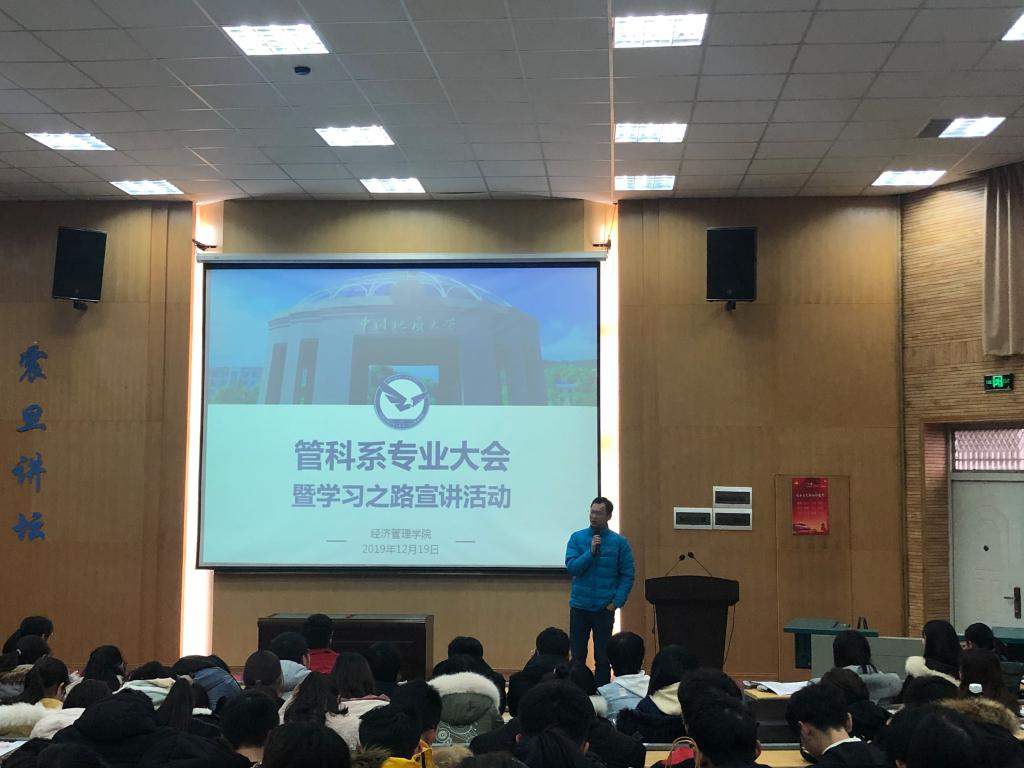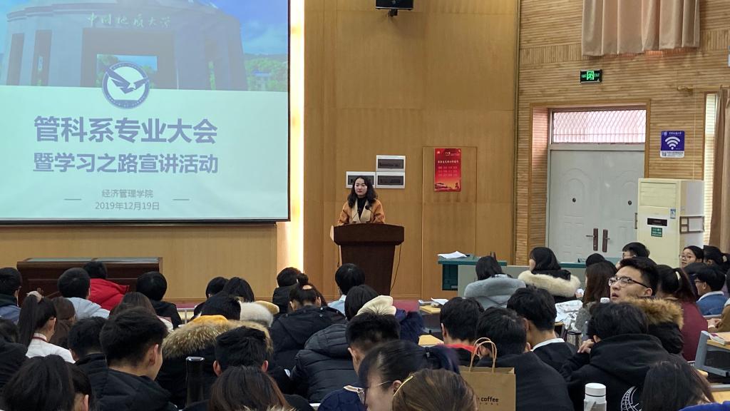 2019年12月19日,2026世界杯预测管理科学与工程系本科生专业大会暨学习之路宣讲活动在教三楼109召开,管科系副主任翁克瑞老师、管科系辅导员徐媛老师出席大会,17-19级管科系全体员工参会,会议由徐老师主持。