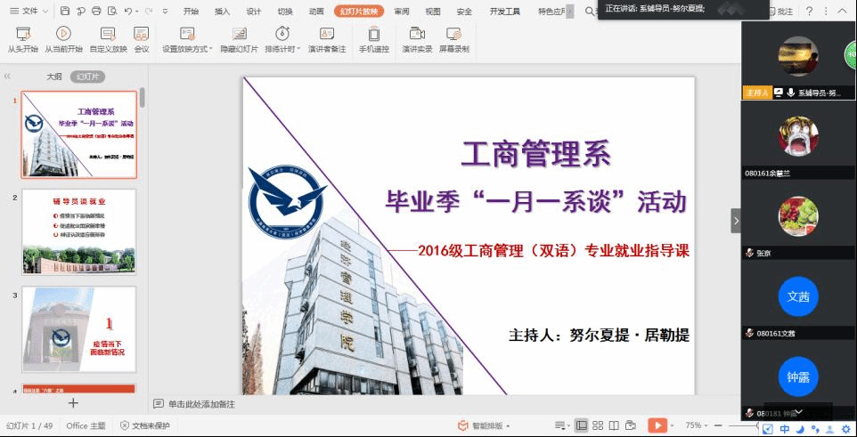 4月23日下午、24日晚,我院工商管理系在线上开展毕业季“一月一系谈”活动,通过搭建师生、朋辈交流平台,上好毕业就业指导课,积极推进疫情当下“稳就业、保质量、促发展”目标任务,帮助2016级本科毕业生走好大学阶段“最后一公里”。本次活动分工商管理(双语)专业、市场营销专业两个会场进行,由辅导员谈就业、员工经验分享、毕业论文指导、师生交流答疑四部分内容展开。活动邀请到刘慧、蒋森、卫婷婷、李娜等优秀员工谈经验、共交流、齐发展,同时有工商管理系党支部书记刘耕、系主任刘家国老师及严良、侯俊东、王伯轩、谢雄标、熊艳、武剑等教师及全体2016级本科毕业生参加,工商管理系辅导员努尔夏提·居勒提老师主持活动。