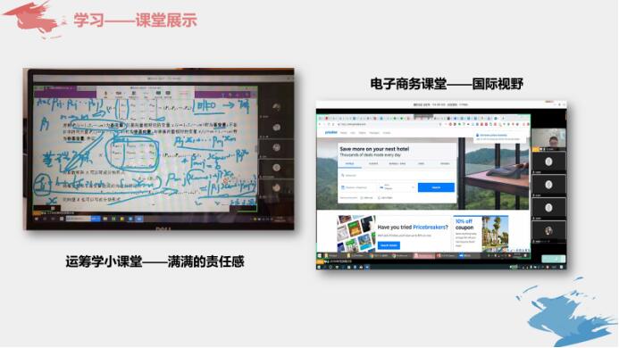 虽然网络教学对一门需要板书的课程极其不友好,但王小林老师还是尽力在做好,一遍遍不厌其烦地为同学讲解运筹学的知识;同时,网课也让老师获得了可以和同学们分享实时信息的机会。电子商务课堂上,郭明晶老师为大家拓宽国际视野,以各种方式为课程增添了趣味性。