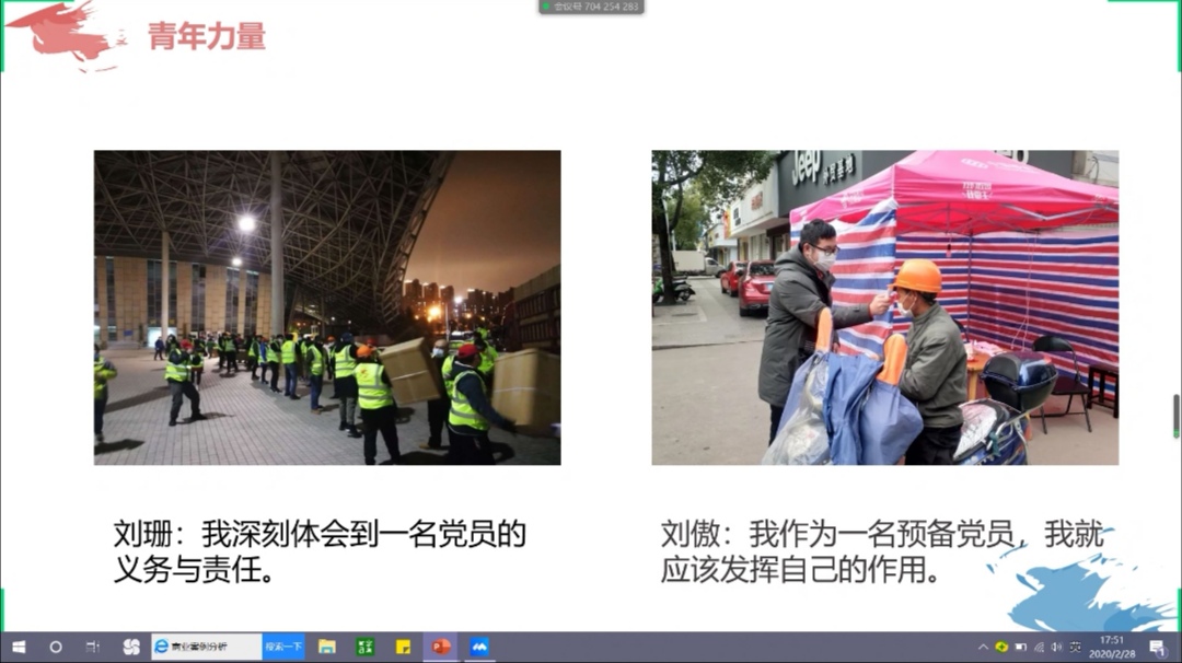 班会中,团支书刘亚旭以我们身边的校园卫士、地大员工、青年榜样的鲜活典型为例,讲述了在疫情期间默默为人民付出的事迹,让同学们引起共鸣。听从党的召唤,风雨兼程到校医院工作的刘艳华;不知姓名为公司教学楼消毒的校园卫士;拥有24年党龄的地大员工,火神山、雷神山项目后勤保障内外部总协调负责人罗飞;还有为抗击疫情贡献自己的力量的志愿者同学们和可爱的班主任刘耕老师都是我们学习的榜样。他说“有党和国家的领导,有人民群众的众志成城,我们有理由相信在不久的将来疫情就能够的得到有效的控制。”来自武汉的余佳颖、方一楠同学对疫情感受最为真切。她们分别向大家分享了身在武汉的生活感受,以及讲述了受抗击疫情前线的妈妈的影响,在社区担任志愿者的故事。