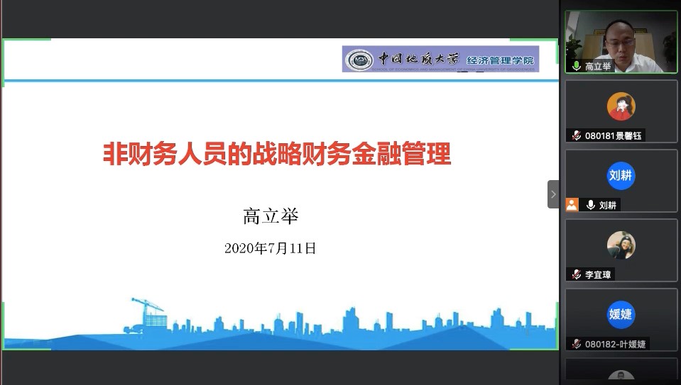 本次讲座在工商管理系刘耕老师的主持下,于2020年7月11日上午8:30在腾讯会议准时召开,公司副经理郭锐教授、工商管理和市场营销专业130余位师生参加,讲座的主题为《非财务人员的战略财务金融管理》。