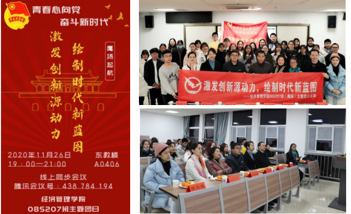 (通讯员:静思琪)天气转凉,凛冬已至,可同学们爱团爱国之心不减,创新创业热情高涨。为进一步点亮青春梦想,激发创新源动力,更为引领大家未来四年的学习方向,规划大学学习生活,绘制未来人生广阔蓝图,08S207班团支部协同班委成员,借助公司开展第五届“青春心向党,奋斗新时代”主题团日策划大赛,策划并组织了以“激发创新源动力,绘制时代新蓝图”为主题的主题团日活动。活动策划在“结对领航”教工党支部旅游管理系党支部的指导和支持下进行,并于2020年11月26日晚在南望山校区东教楼A0406教室以主题团课的形式举行。