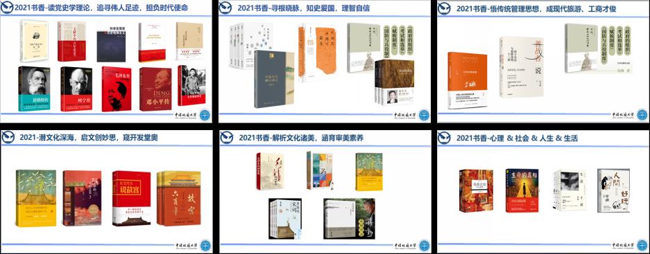 2021旅游管理“书香班级”大幅添购五大主题书籍,活动向班级书库赠入的图书既有党史及其理论学习读本,又有大众历史和传统文化读物;既有中西经典,又有古今论著;既有中国传统管理智慧,又有现代旅游文创妙思;既有深度理论名著,又有口碑生活读物。其中,为方便大家的党史学习和随时阅读,此次活动专门购入了党史及其理论相关书籍,如《<共产党宣言>导读》《文献中的百年党史》《习近平新时代中国特色社会主义思想基本问题》等,以及马克思、恩格斯、列宁、毛泽东、邓小平、习近平等马克主义者和无产阶段革命家、思想家、理论家的传记体读本。其中,特别选购了《青年马克思是怎么炼成的》《解读青年毛泽东》《习近平的七年知青岁月》等记录和研究伟人和领袖青春时期的人生经历及其思想的形成、转变历程的读物,旨在引领青年老员工在自身的学习和成长中,能结合当代社会发展形势和时代责任使命思考和选择好自已的人生。