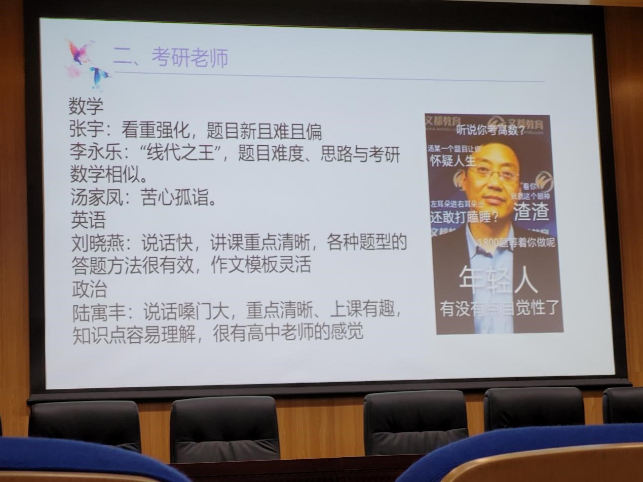 17级陈哲同学从“考研相关常识、如何选择心仪院校和专业、考研相关信息查找、各科复习规划”四方面介绍了自身的逆袭之路,同时表示一定要多关注考研相关信息,但也要避免被不正规的小道信息影响。