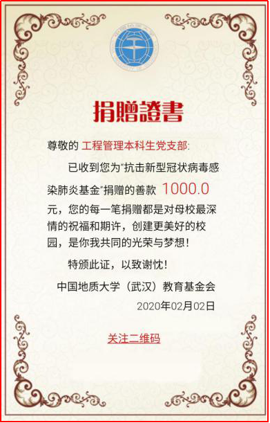 工程管理专业本科生党支部在这场防疫攻坚战中充分显示了其执行落实力和组织动员力。支部积极响应公司号召,落实公司党委的具体工作部署,利用党支部工作群,号召党员学习领会中共中央关于疫情防控的重要会议和决策部署;支部主动做好疫情防控的宣传工作,要求支部党员积极通过线上方式在班团中做好防疫宣传和员工心理疏导工作,“一个不少”针对支部所辖班团转发《致地大寒假留校员工的一封信》《致全体地大学子的一封信》《关于进一步加强员工留校及返校管理的通知》《关于开通心理支持网络服务的通知》《关于面向全校员工开通心理支持热线的通知》等重要文件。支部还号召党员力所能及地为重点疫区捐款捐物,支部内部募捐经费向地大教育发展基金会的“抗击新型肺炎基金”项目捐款1000元,以支部和党员个人名义向全国各地防疫相关基金会捐款共计3500余元。