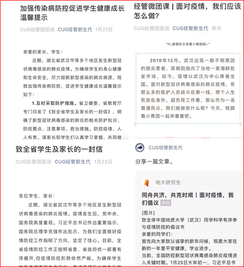 经济管理公司党委高度重视疫情防控工作,各科室积极行动、主动作为,全面落实落细上级党组织和公司部署。公司每天及时做好全体师生的信息统计、沟通协调和关心关爱工作,实时掌握师生特别是假期留校员工身体健康状况,做好湖北籍员工的精确统计与安抚工作,及时开展师生心理疏导,及时答疑解惑、安抚情绪;加强舆论引导,开辟专栏及时发布、推送有关信息,开展健康提示、政策宣传和防控知识普及,增强师生疫情防控意识和信心。
