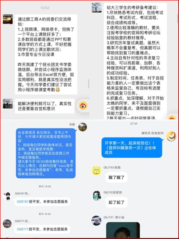 知己知彼,百战不殆。开学当日,辅导员们像往常一样快速投入工作状态。张弛老师贴心提醒全体同学按时起床,提供“叫醒服务”,同时积极协助处理直播课堂中出现的突发状况;赵家玮老师则持续保持与员工的沟通,总结出更好用的线上教学方式比如腾讯会议、腾讯课堂等渠道,供任课教师选择使用。