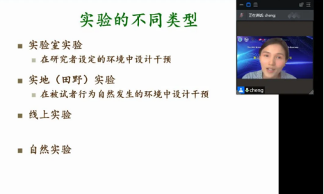 第二位报告人,来自清华大学的易成副教授为我们带来了“基于实验方法的研究实例分享”线上主题报告。易成副教授介绍了实验的不同类型,详细讲解了常见的实验设计问题,如自变量和因变量的选择、自变量的操纵、因变量的测量等。