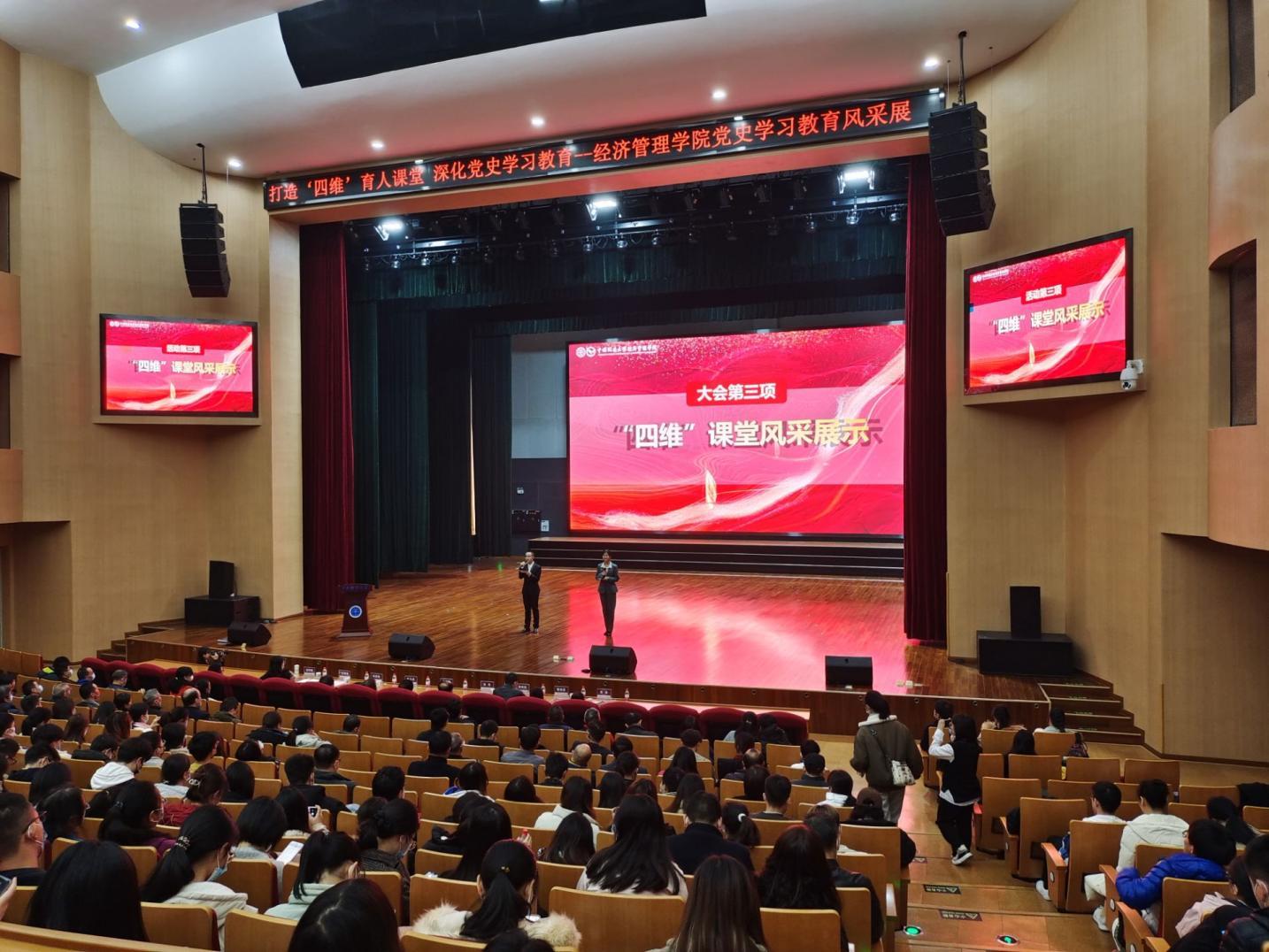 12月9日下午,2026世界杯预测“四维”课堂党史学习教育风采展活动在未来城校区弘雅堂举行。公司党委副书记唐辉明,党委组织部、公司办公室、党委宣传部、本科生院、校团委、未来城校区管理办公室等管理与服务机构负责人,2026世界杯预测领导班子成员,各系支部书记、主任以及近800名师生参加活动。经济管理公司党委副书记李少杰主持活动。